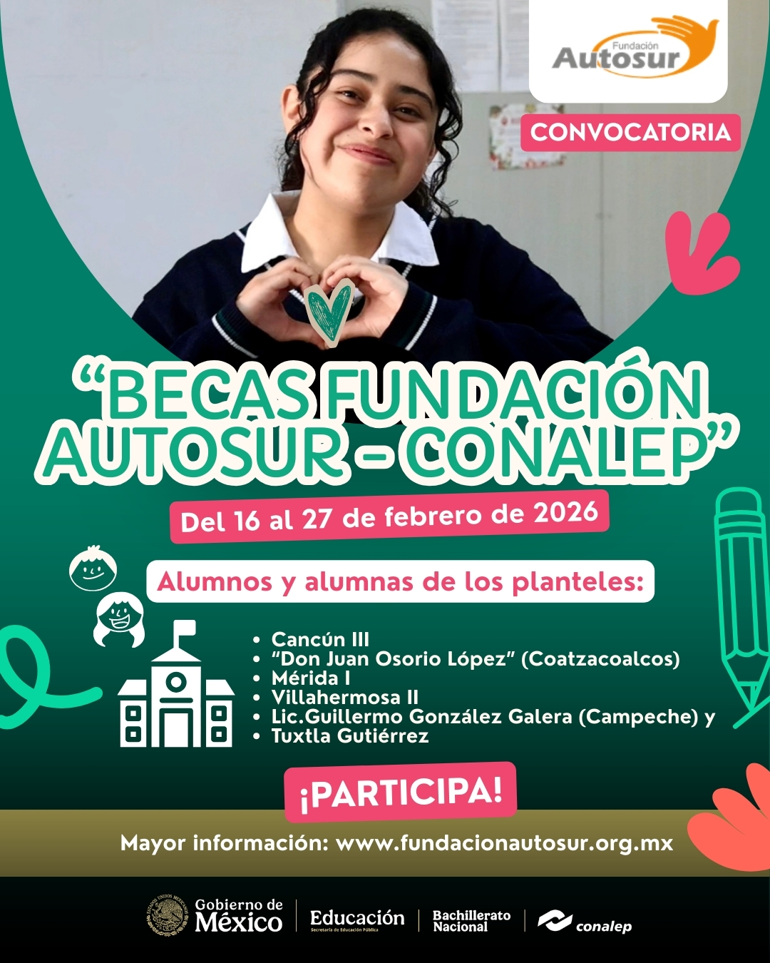 A los estudiantes de los planteles Cancún III, "Don Juan Osorio López" (Coatzacoalcos), Mérida I, Villahermosa II, Lic. Guillermo González Galera (Campeche) y Tuxtla Gutiérrez del Colegio Nacional de Educación Profesional (CONALEP) se les invita a participar en el concurso abierto al público en general para el otorgamiento de becas para realizar estudios de profesional técnico bachiller con reconocimiento d e validez oficial en los términos de la Ley General de Educación, en adelante "Becas Fundación Autosur-CONALEP".